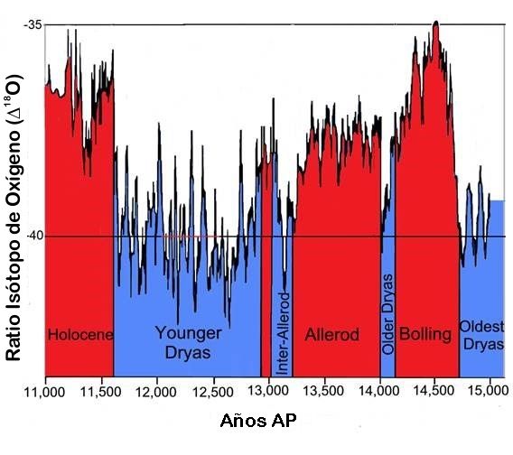 15,000 years ago, the Ice Age was in full swing. The about 14,500 years ago, temperatures abrupt soared to slightly below present-day temps, then just as abruptly plummeted back to full glacial conditions (the YD) for about 1000 years, then soared once again to the early Holocene maximum. These abrupt changes in temp, both warming and cooling, occurred in about a century.