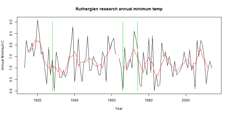 I’ll illustrate. Here is the plot of Rutherglen annual minimum. I’ve marked the years of change in green, according to the chart in Jennifer’s report. And I’ve put a five year running mean in red. You can see that each corresponds to a steep down dip. That is what the algorithm picks up, and asks, is this real? So it checks the neighbor stations to see if they did that too. If not, it says it wasn’t, and moves the earlier part up or down to minimise the apparent discontinuity.