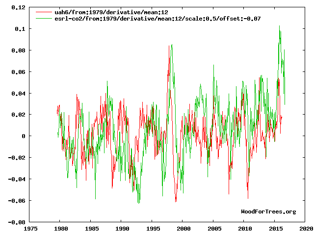 Basically, there is a correlation on that graph because temperature has gone up a bit between 1958 and 2017 (not a lot of disagreement there, except perhaps as to the amount), and the “derivative”, i.e. the rate of increase of CO2 has gone up a bit too. The plot of CO2 at Mauna Loa is not a straight line; it curves upwards, i.e. the rate of increase of CO2 is increasing (as the mathematicians say, the second derivative is positive).