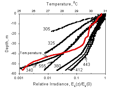 From Coral Bleaching, UV Effects, and Multiple Stressors in the Florida Keys, this indicates strong sunshine has it’s strongest effect closest to the surface, important under low sea level conditions as described in the post: