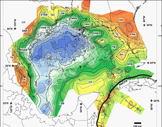 The Gulf of Mexico basin is filled with up to 50,000′ of sedimentary column from the Jurassic up to the Quaternary.