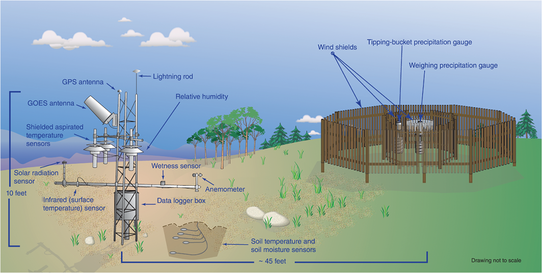 Each site will need to be large enough to house all instrumentation without adjacent instrumentation interfering with one another, with no shading or wind-blocking vegetation or localized topography, and at least 100 m from any artificial heat sources. Figure 2 provides a site schematic for USCRN stations that meets this goal. The siting should strive to adhere to Class 1 criteria detailed in guidance from the WMO Commission for Instruments and Methods of Observations (World Meteorological Organization, 2014, part I, chap. I). This serves to minimize representativity errors and associated uncertainties. Sites should be chosen in areas where changes in siting quality and land use, which may impact representativity, are least likely for the next century. The site and surrounding area should further be selected on the basis that its ownership is secure. Thus, site selection requires an excellent working and local knowledge of items such as land/site ownership proposed, geology, regional vegetation, and climate. As it cannot be guaranteed that siting shall remain secure over decades or centuries, sites need to be chosen so that a loss will not critically affect the data products derived from the network. A partial solution would be to replace lost stations with new stations with a period of overlap of several years (Diamond et al., 2013). It should be stressed that sites in the fiducial reference network do not have to be new sites and, indeed, there are significant benefits from enhancing the current measurement program at existing sites. Firstly, co-location with sites already undertaking fiducial reference measurements either for target ECVs or other ECVs, such as GRUAN or GCW would be desirable. Secondly, co-location with existing baseline sites that already have long records of several target ECVs has obvious climate monitoring, cost and operational benefits.
