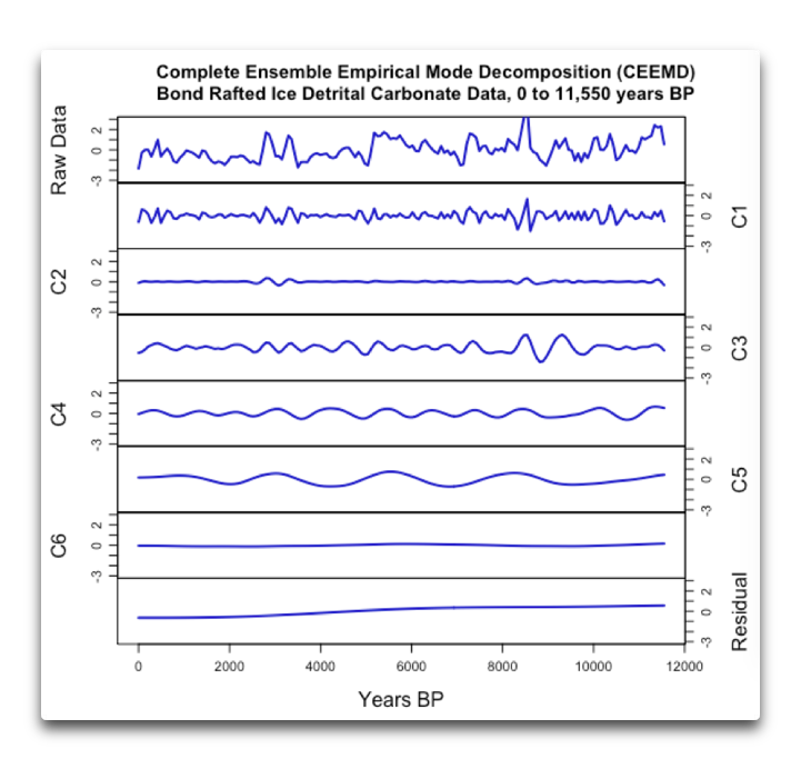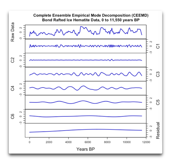 I saw the graph titled “Empirical Mode C5 Four Bond Ice Rafting Datasets”, and so I did my own overlay of all of the empirical modes. One thing I saw is that the two glass ones are practically identical and that it could be useful to combine them into one dataset. Another thing I saw is that C3 lined up well in all four datasets for most of the past 5,000 years, impressively well for nearly 7.5 cycles, and C4 lined up impressively well for the past nearly 6,000 years or 5 cycles. For that matter, C4 lines up well through the past nearly 9,000 years or nearly 9 cycles in all four datasets, except for the hematite dataset missing one positive peak around 6500 years ago. I see this as some evidence that a periodic item in C4 with a period close to 1,000 years is for real.