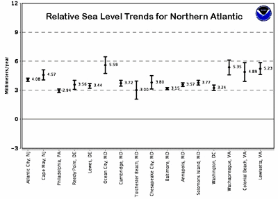 Does this mean that the surface of the Atlantic Ocean is rising almost three times as fast in some places along the coast as in others? That the surface of the Atlantic is rising three times as fast at the Chesapeake Bay Tunnel (5.92 mm/yr) as in Southport, N.C. (2.01 mm/yr)?