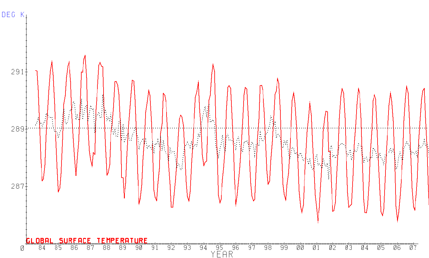 The errors from NOAA-14 have been known by GISS for some time. This is a plot of the raw monthly average temperatures reported in the ISCCP data set.