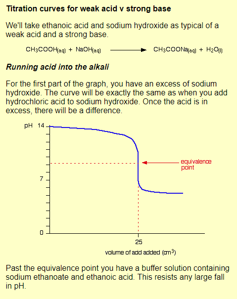 And it is different. Here, from here, is the titration curve of NaOH and acetic acid. Note the equivalence point, with equal moles of each, and equivalent to pH 7 in a regular titration. But it is at about pH 9.