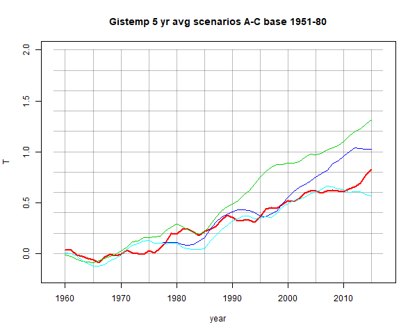 It can’t be that, because the Gistemp 5-year running average anomaly with the start centred 1960 is currently sitting at 0.85 C; whereas the red line on the featured chart only goes up to 0.50 C. Whatever that red line represents, it’s not a Gistemp data.