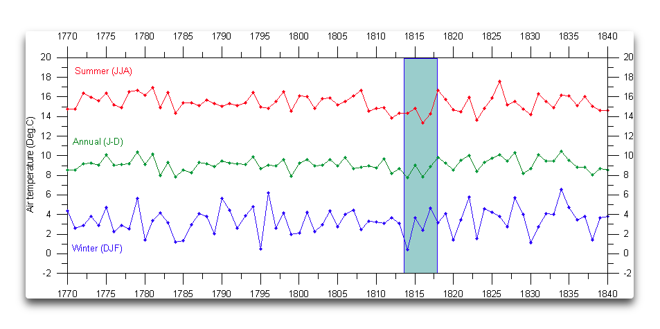 Hi All- the German record i mention above shows five yrs, 1813-1817 are 0.5-1.0 dgC below the average. So the year without summer had some precursor?