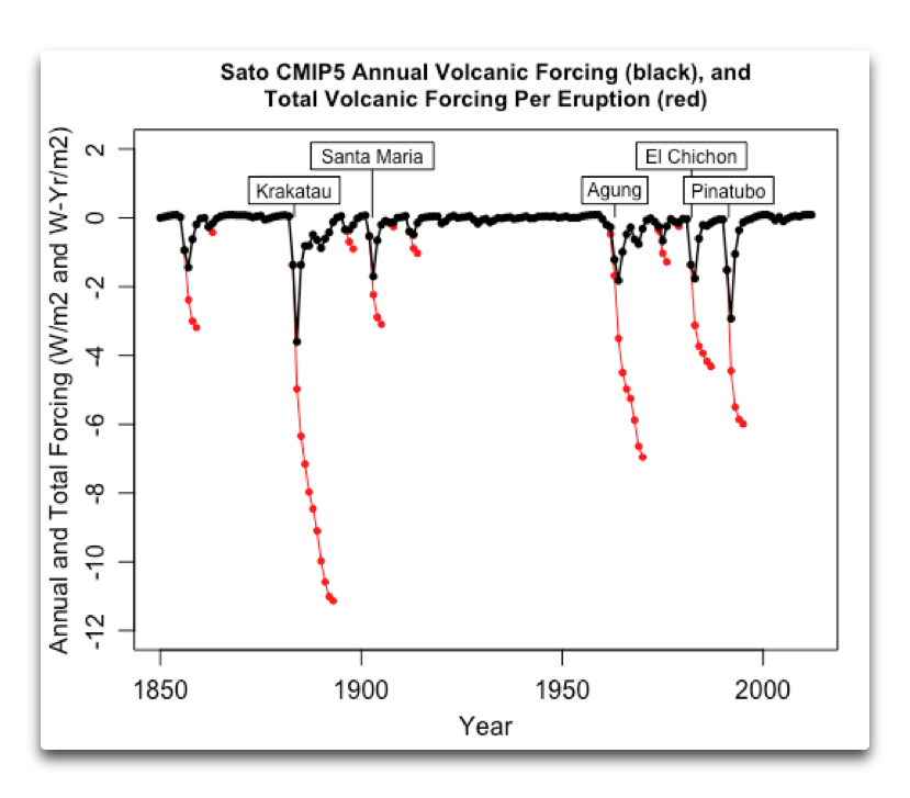 The claim is often made that volcanoes support the theory that forcing rules temperature. The aerosols from the eruptions are injected into the stratosphere. This reflects additional sunlight, and cuts the amount of sunshine that strikes the surface. As a result of this reduction in forcing, the biggest volcanic eruptions…