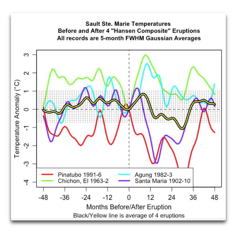 But wait, I hear you thinking, maybe it’s only the biggest ones that cause such a response. So I looked at the six largest eruptions shown in Figure 1 above, those with a volcanic explosivity index (VEI) of 6 or larger. Figure 3 shows that result.