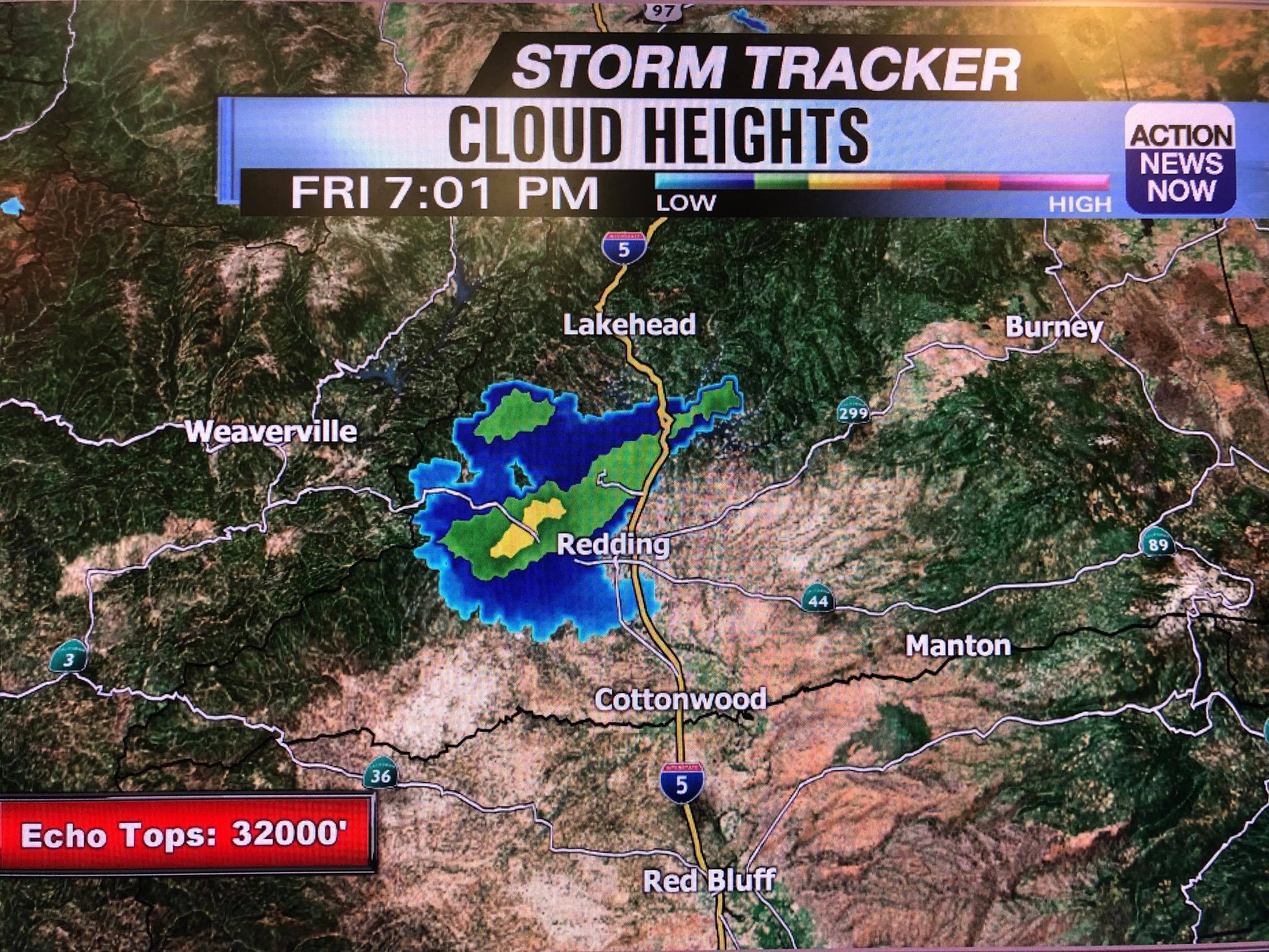 Using Doppler radar, he notes; Tops of the Pyrocumulus cloud over the #CarrFire are now up to 32,000’!