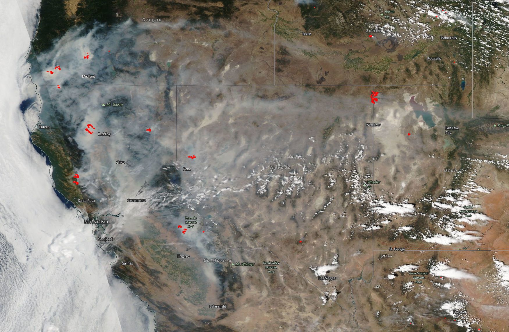 NASA’s Aqua satellite captured this natural color image of the fires in California and the resultant smoke that has shrouded the state and swept eastward as far as Salt Lake City and still moving. Dangerous and deadly fires have broken out across the state including the Carr fire inferno and the long-standing Ferguson fire near Yosemite National Park as well as the Mendocino Complex north of Santa Rosa.