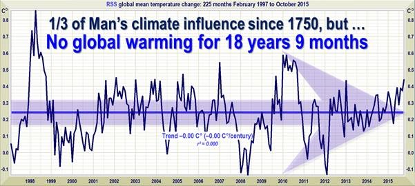 [Fig 1.] The least-squares linear-regression trend on the pre-revision RSS satellite monthly global mean surface temperature anomaly dataset showed no global warming for 18 years 9 months from February 1997 to October 2015, though one-third of all anthropogenic forcings had occurred during the period of the Pause. Ted Cruz baited Senate “Democrats” with this graph in November 2015.