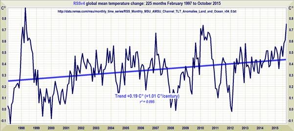 As things turned out, Dr sMear need not have bothered to wipe out the Pause. A large el Niño Southern Oscillation did that anyway. However, an interesting analysis by Professor Fritz Vahrenholt and Dr Sebastian Lüning (at diekaltesonne.de/schwerer-klimadopingverdacht-gegen-rss-satellitentemperaturen-nachtraglich-um-anderthalb-grad-angehoben) concludes that his dataset, having been thus tampered with, can no longer be considered reliable. The analysis sheds light on how the RSS dataset was massaged. The two scientists conclude that the ex-post-facto post-processing of the satellite data by RSS was insufficiently justified –