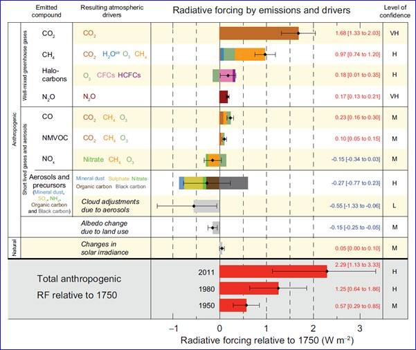 [Fig 12.] Fudge, mudge, kludge: the aerosol fudge-factor greatly reduces the manmade radiative forcing and falsely boosts climate sensitivity (IPCC 2013, fig. SPM.5).