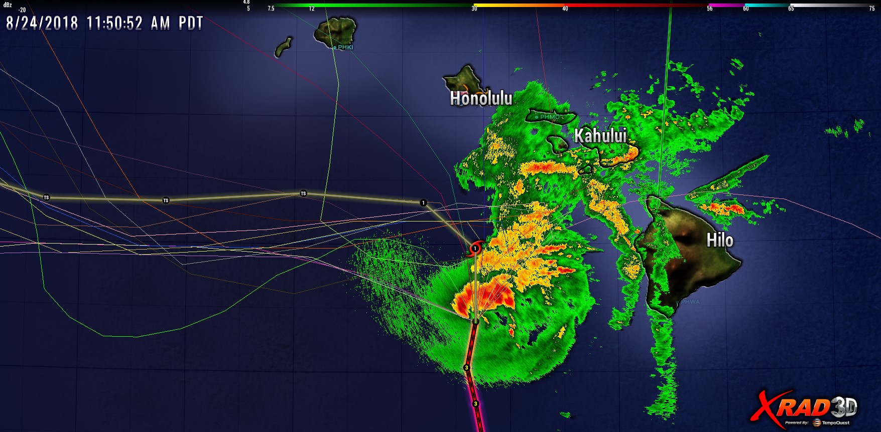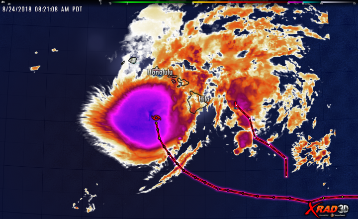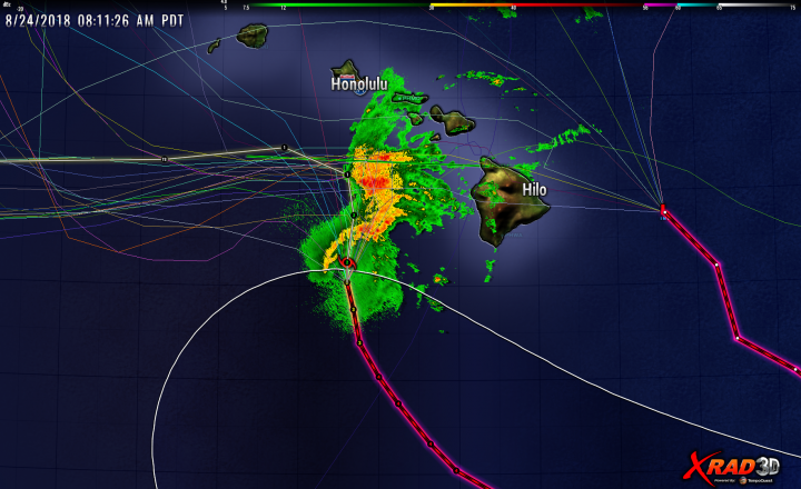 Here’s the most recent tracks and radar showing Lane at Cat2 level. Note that the position marker at the next update period suggests Lane will drop to a CAT1 storm before turning west. It appears there will be no direct hit on the Hawaiian Islands (Oahu was a big concern), but there will lots of rain from rain bands.