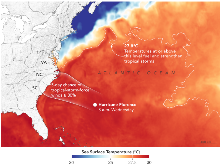 The map above shows sea surface temperatures on September 11, 2018. Meteorologists generally agree that sea surface temperatures (SSTs) should be above 27.8°C (82°F) to sustain and intensify hurricanes (although there are some exceptions). In Florence’s case, National Hurricane Center forecasters expect the storm to pass over water with temperatures well above that threshold. The data for the map were compiled by Coral Reef Watch, which blends observations from the Suomi NPP, MTSAT, Meteosat, and GOES satellites and computer models. Information about the storm track and winds come from the National Hurricane Center.