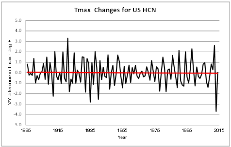 Figure 1 illustrates the incremental changes in surface air temperatures based on year to year differences in station average Tmax. The data is from all active stations in the US Historical Climatology Network (USHCN) from 1895 to 2014.