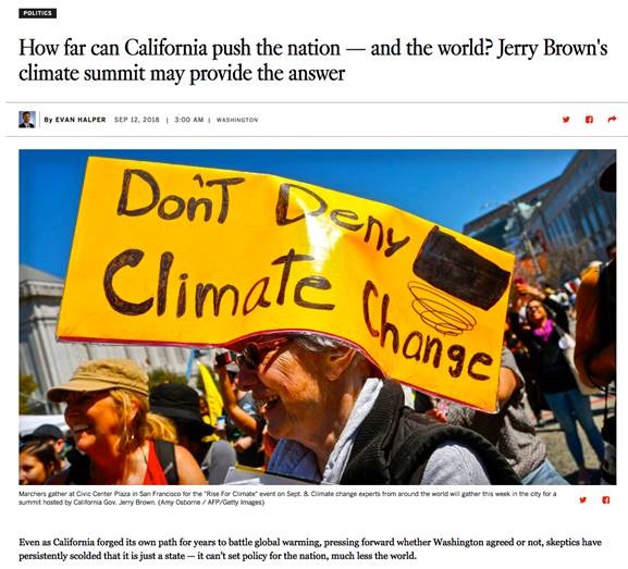 Gov. Brown’s “Global Climate Action Summit” held in San Francisco during the week of September 10, 2018 should really have been labeled the “Global Climate Hype Summit”.