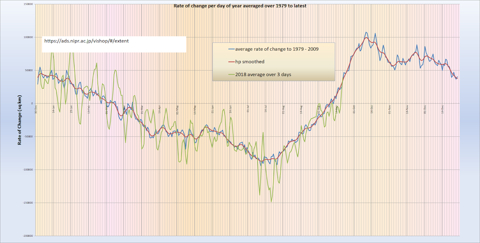 Antarctic sea ice extent has been in the normal range most of the season, but just had a dip and recovery, I assume it must have been stormy to change that fast, piled up and then relaxed again? Looks like the max. extent will end up very similar to last year. It’s such a vast area that any perceived deficit is really just nibbles.