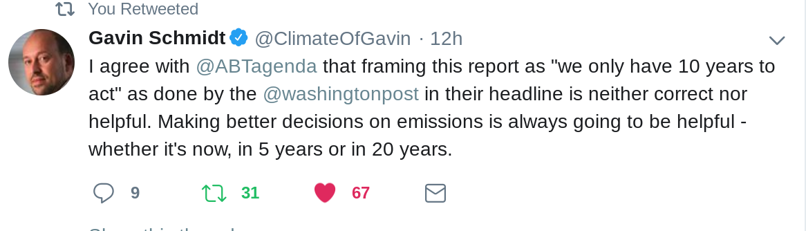 Schmidt tweeted on October 7: I agree…that framing this report as ‘we only have 10 years to act’ as done by the Washington Post in their headline is neither correct nor helpful. Making better decisions on emissions is always going to be helpful – whether it’s now, in 5 years or in 20 years.”