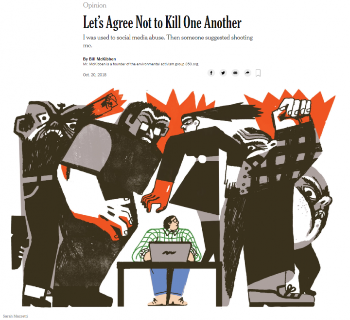 In the article, Mr. McKibben says:”I was used to social media abuse. Then someone suggested shooting me.”