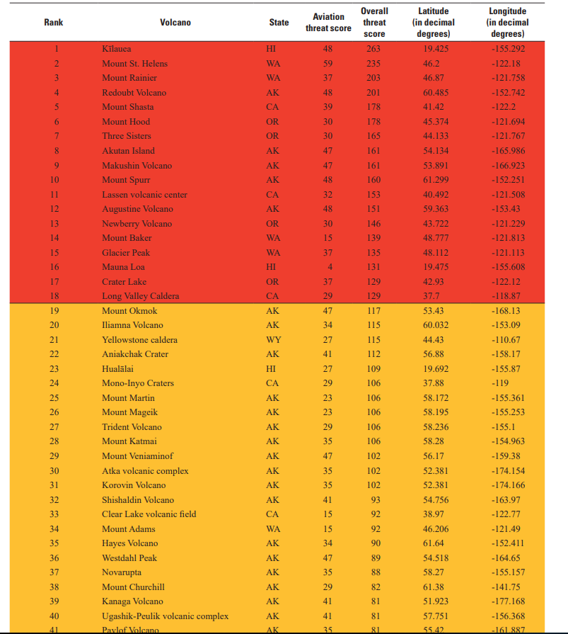 The list of 18 very high threat volcanoes determined by Ewert and others (2005) remains the same; 11 of the 18 volcanoes are located in Washington, Oregon, or California, where explosive and often snow- and ice-covered edifices can project hazards long distances to densely populated and highly