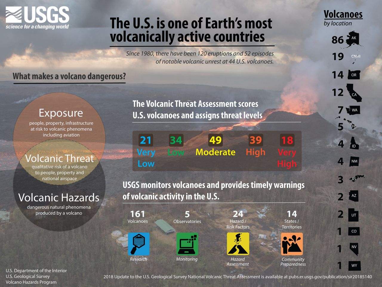 The United States has 161 young, active volcanoes within its borders. Since 1980, there have been 120 eruptions and 52 episodes of notable volcanic unrest at 44 U.S. volcanoes.