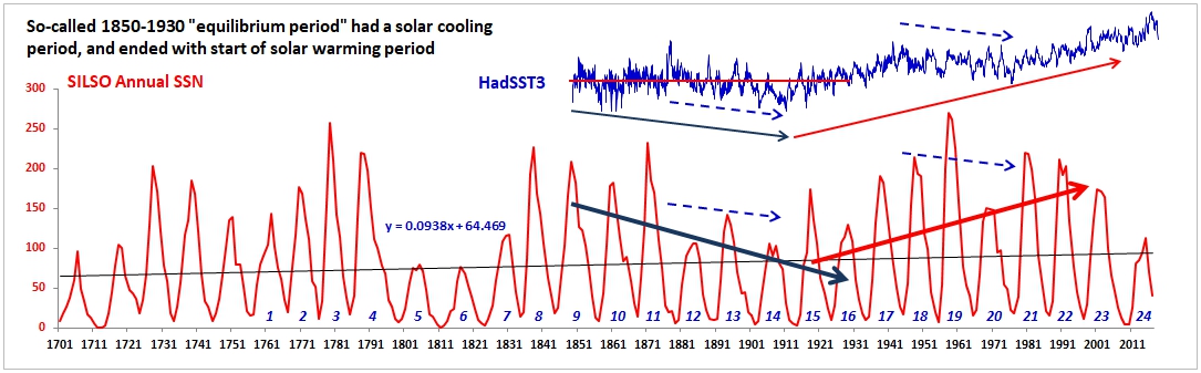 Then we have the Maunder Minimum. Temperatures started dropping about 150 years before the start of the Maunder Minimum, and during the first hundred years of dropping temperatures the sunspots were increasing. So obviously, the sun was not the cause of the drop in temperature.