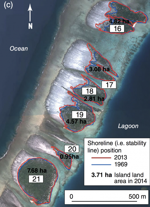 Likewise, within a given atoll, nearby islands and island shorelines (either ocean-facing, or lagoon-facing) commonly experienced opposite behaviors. The patterns of atoll island planform change are resolutely atoll- and even in some cases island-specific.