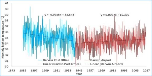 Figure 1 –sample long-term-trend thermometer results (Alice Spring, NT, Australia). The temperatures were recorded in the Post Office / City and Airport locations. Data downloaded from www.bom.gov.au/climate/data/.