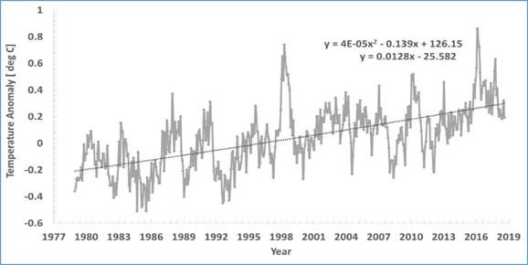 Figure 7 – Lower troposphere temperature results. Data downloaded from www.nsstc.uah.edu/data/msu/v6.0/tlt/uahncdc_lt_6.0.txt. The latest global 30 years warming rate is 1.25 °C/century, without any acceleration. It is not uniform, as it is maximum at the north pole, 60N-90N, 2.2 °C/century, and minimum at the south pole, 90S-60S, 0.8 °C/century.