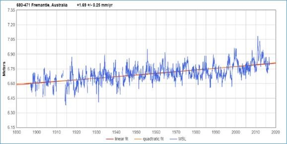 Fremantle is 12 miles from Perth city centre. The entire greater Perth coastal plain region has been extracting vast amounts of ground water which has lead to subsidence. The implications on the Fremantle tide gauge is that the modest measured SLR may be largely due to subsidence not global SLR. In reality I suspect Fremantle being right on the coast is largely unaffected by ground water subsidence or at least not as much as Perth City.