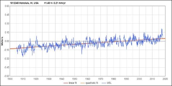 Figure 9 – sample long-term-trend tide gauge result (Honolulu, HI, USA). In Honolulu the slope is +1.482 ±0.212 mm/yr. and the acceleration is -0.00539±0.01450 mm/yr². Image reproduced modified after www.sealevel.info.