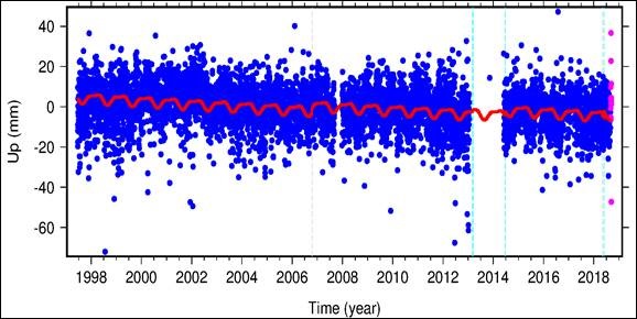 Figure 10 – likely subsidence in the sample long-term-trend tide gauge location of Fremantle (PERT from GPS). The slope is -1.933±0.603 mm/yr² in PERT. Image reproduced modified after geodesy.unr.edu.