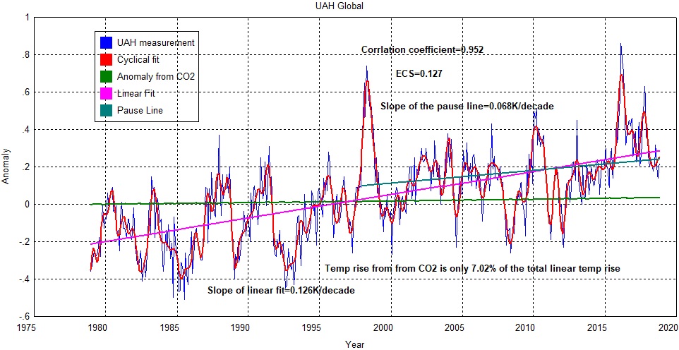 Now to illustrate just how foolish this report is I added a new line to my graphs in my cyclic analysis of UAH data. My cyclic analysis with a contribution from CO2 is a very good match to the measured data.