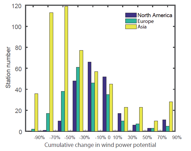 Consistent with the decrease of surface wind speeds, the wind power potential was also decreasing in most regions of the Northern Hemisphere in the past decades. Around one third of the stations in North America, have experienced a huge decrease (over 30 percent) in wind power potential while over half of the stations in Europe and around four-fifths in Asia have the same magnitude of decrease.