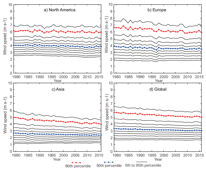 A new study focusing on the change in wind energy resources and models’ simulation ability over the Northern Hemisphere by the collaboration of IAP researchers–Ph.D. candidate Qun Tian, Professor Gang Huang, Associate Professor Kaiming Hu, and Purdue University researcher–Professor Dev Niyogi was recently published. It reveals a widespread decline in wind energy resources over the Northern Hemisphere. Using station observation data, the study finds that approximately 30%, 50% and 80% of the stations lost over 30% of the wind power potential since 1979 in North America, Europe, and Asia, respectively. The study also reveals that global climate models (GCM) cannot replicate the long-term changes on wind energy, indicating wind energy projections based on GCM simulations should be used with careful consideration to the model performance.