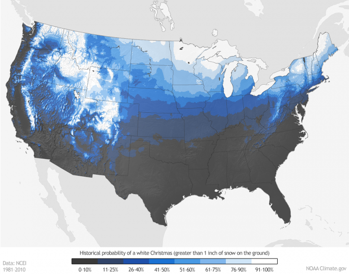 If you would like to keep track of the snowfall across the United States on a daily basis, see the National Operational Hydrologic Remote Sensing Center’s National Snow Analyses. For a more detailed assessment of the probability of a white Christmas as well as documentation of the methodology used to calculate the map’s underlying climatological statistics, see the scientific paper, White Christmas? An Application of NOAA’s 1981-2010 Daily Normals, by NCEI scientists and published in the Bulletin of the American Meteorological Society. You can also download a spreadsheet to see the full list of stations and their historic probabilities.