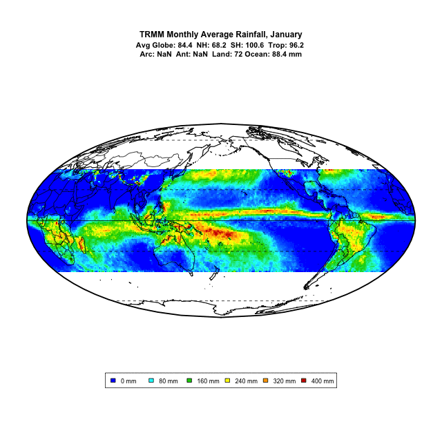 Figure 5. Movie loop of the monthly averages of the tropical rainfall, Dec 1997 – Mar 2015. The coverage of the mission only extends from 40°N to 40°S. Note that this covers about two-thirds of the surface of the planet. Units are mm/month.