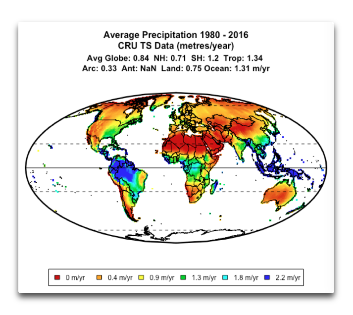 Next, since the Indian study concerned the recent decades, I looked more closely at the average rainfall over that period. Figure 2 shows the average rainfall around the globe for the period 1980 through 2016.