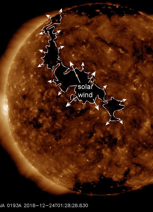 This storm was caused not by sunspots, which have been absent for most of 2018, but rather by a hole in the sun’s atmosphere. NASA’s Solar Dynamics Observatory photographed the gaseous fissure on Dec. 24th: