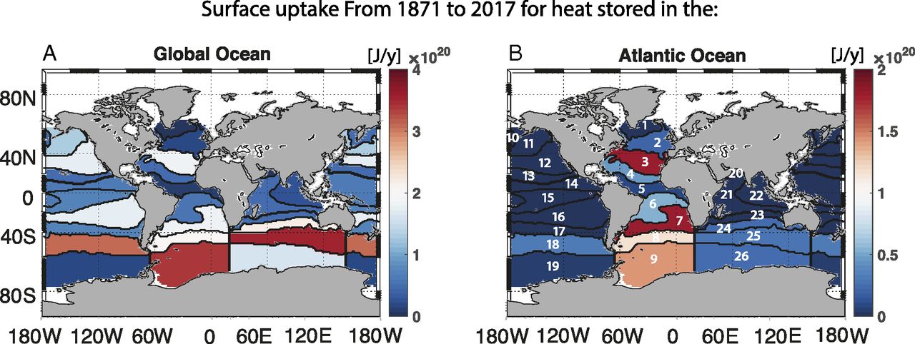Cumulative heat uptake from 1871 to 2017 (joules per year) shown for each patch (numbered here and shown in SI Appendix, Fig. S1), contributing to the integrated passive heat storage (A) globally and (B) in the Atlantic Ocean. Note the different scales for the two panels.