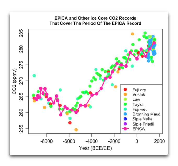 “. . . . . so here are all of the ice core CO2 records that I can find that cover the period of the EPICA dataset.”