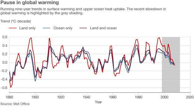 In the same way the decrease in the rate of warming since 1997.5 is equally real. You cannot tell me that it hasn’t happened. There are hundreds and hundreds of articles on the pause in global warming. Thousands of scientists, many smarter than you and me, know that the pause (i.e. reduction in the rate of warming) took place. The UK Met Office published a series of three synopsis reports on the pause, the second one entitled: