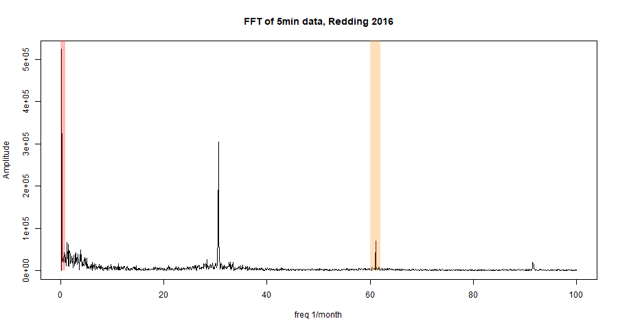 Your spectra are nothing like what happens. Here I have done a FFT of 5 minute data from Redding, CA for 2016. This plot shows magnitude. Frequency units are 1/month (30.5 days). I have marked with a red block the band of unit width around zero. This is the nominal range of data that passes the monthly average filter – of course a larger range passes with more attenuation. That is the data we want. I have marked with orange the range from 60 to 62 units. This is the corresponding range that would be aliased to the red range with 2/day sampling. As you see, it mainly contains a rather small spike, at twice diurnal, and nothing much else. The spike is what would alias to zero. It isn’t that bad anyway, and as I showed in my last post, you can calculate and adjust for it, since diurnal is repeated.