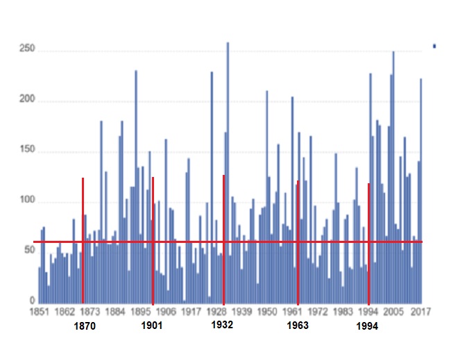 There is an apparent pronounced multi-decadal cyclicity to historical occurrences in this region, and we’re sure to encounter another severe period of activity. Which will undoubtedly be accompanied by ignorant claims from snowflake-wretches of impending planetary climate doom.