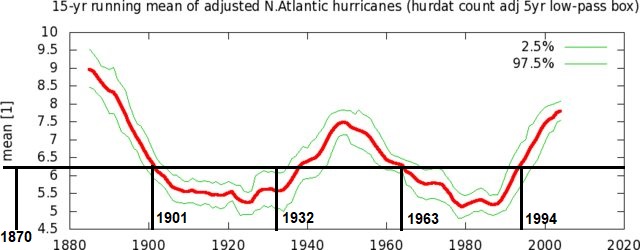 These hurricane graphs are just random noise. Seeming to see patterns in random noise, like seeing animal or human shapes in clouds, is just a fantasy of the human mind. The climate hustlers want to see patterns in random up and downs that affirm a climate change alarmism belief. And cherry picking aids immensely in this regard.