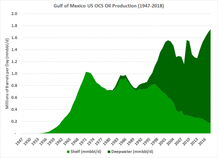 When we look at the aggregate oil production from US Gulf of Mexico shelf, we can see a Hubbert-like pattern: