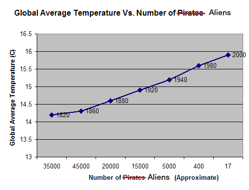 Update (EW): Sharp eyed readers might have noticed my aliens vs global temperature graph shows the opposite of what Dr. Chi is asserting, but getting data upside down is OK in climate science.